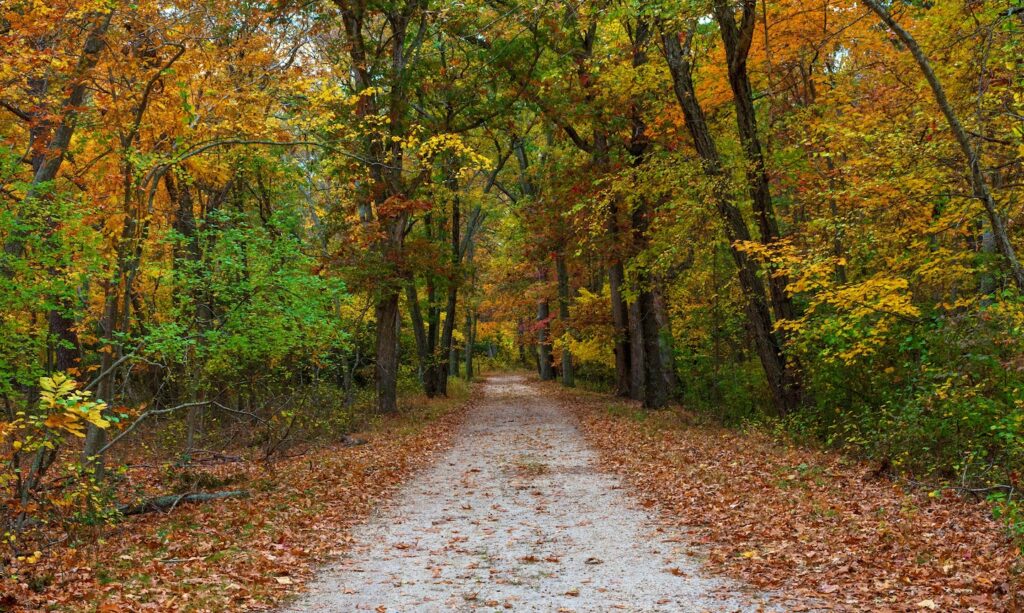 A hiking trail through the Autumn woods in Allaire State Park in New Jersey.